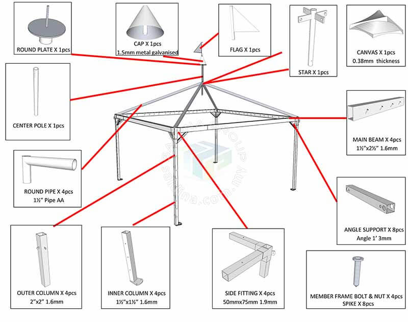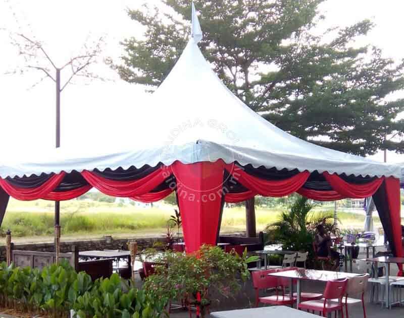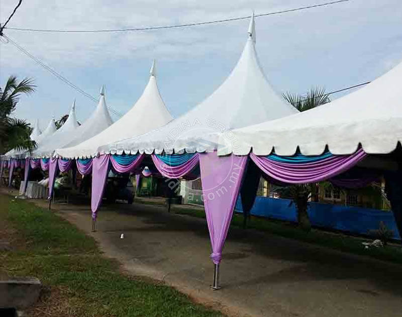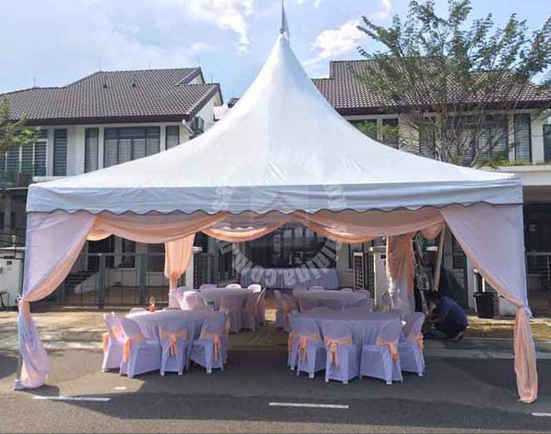 Set lengkap marquee tent 15mx5m dan 20mx5m bagi setiap blok (rangka aluminium & kanvas tebal 0.8mm) bersama peralatan lengkap seperti meja, kerusi, alas meja, skirting, sarung kerusi, riben, scallop, underlayer, backdrop, pentas, kipas dan lampu. Terdapat berbagai pilihan pakej bermula dari 4 hingga ke 10 blok marquee tent. Pelanggan berpeluang memilih berdinging atau tidak.
