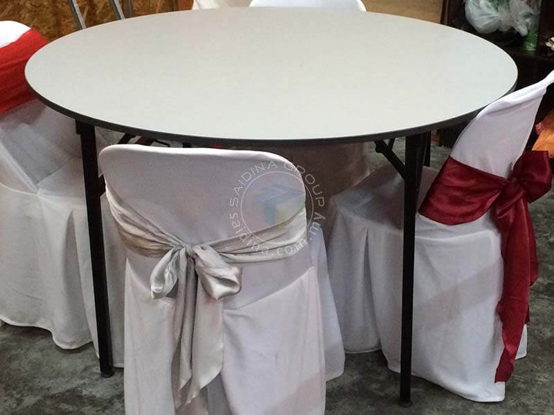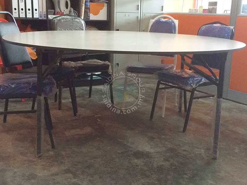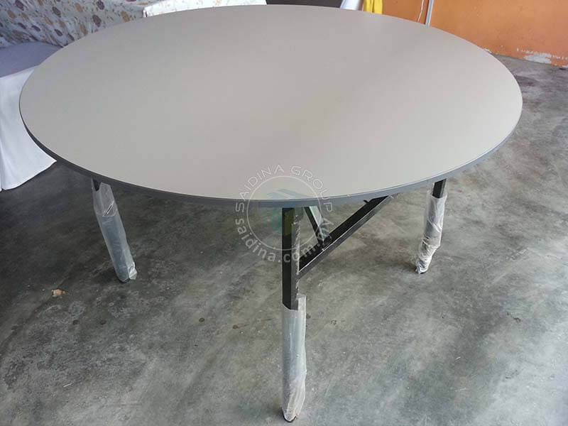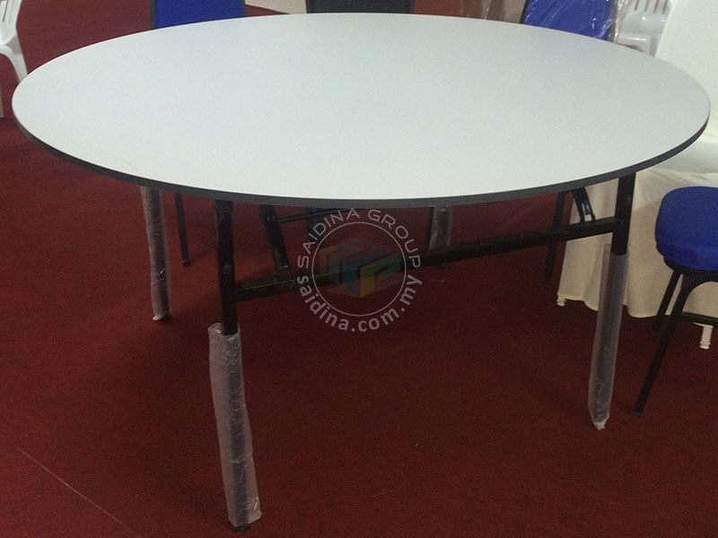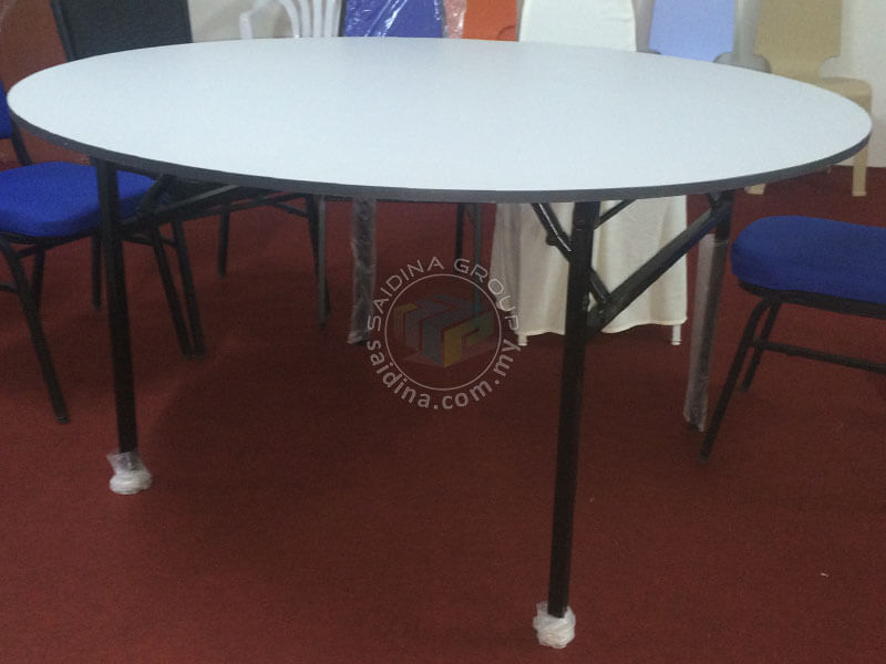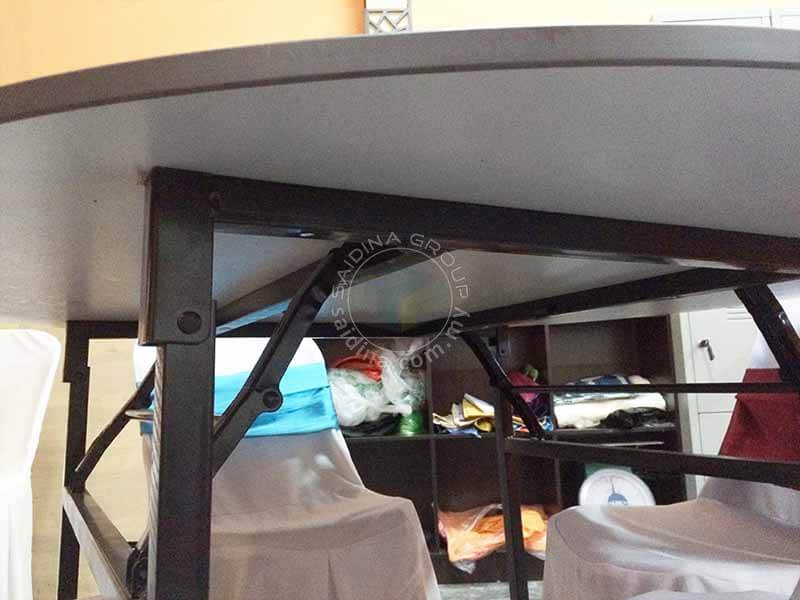 Meja Banquet Berkuaiti yang diperbuat dari Chip board di bahagian atas (top) dengan kaki besi boleh lipat.