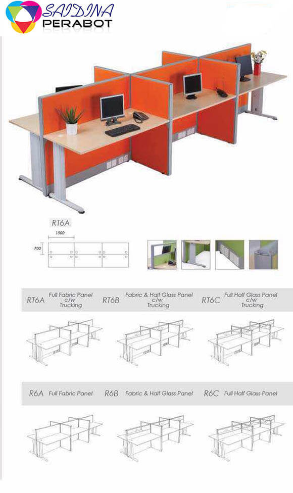 Pertition bersama meja dengan beberapa pilihan warna. Terdapat dua jenis partition iaitu fabrik sepenuhnya dan separuh gelas. Partition ini digunakan di pejabat menjadikan susunan meja lebih teratur dan suasana kerja yang selesa.